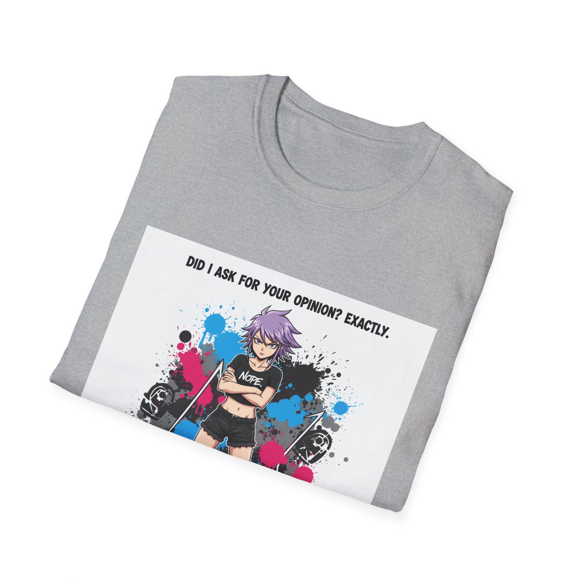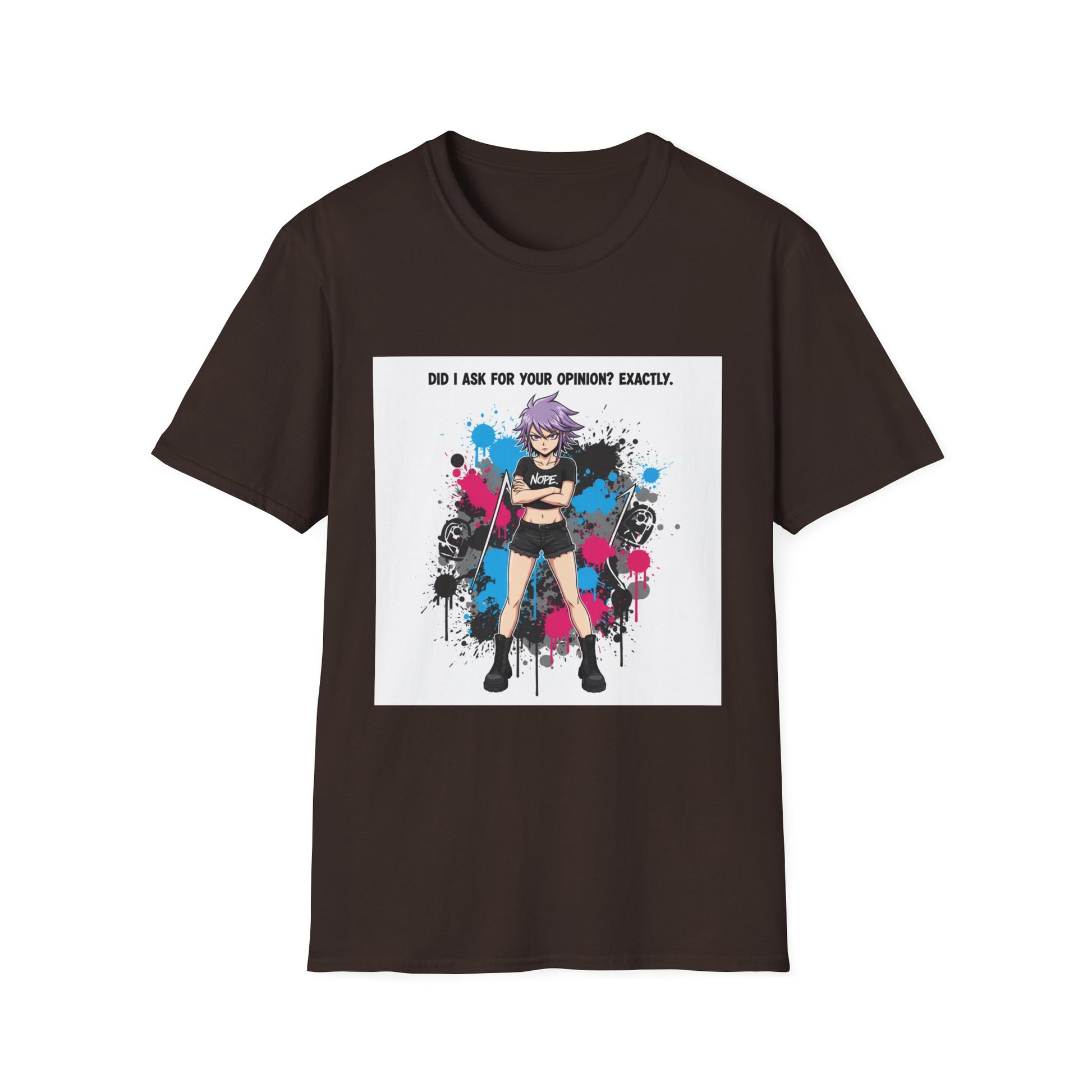 Show off your unapologetic side with this bold anime-inspired graphic tee. Featuring a fierce purple-haired character in combat boots with a defiant stance, this shirt makes a statement loud and clear: “Did I ask for your opinion? Exactly.” Perfect for fans of edgy streetwear, punk, goth, or anime style fashion, this shirt pairs effortlessly with jeans, shorts, or layered looks. Made with soft, durable fabric, it’s as comfortable as it is rebellious. Great for everyday wear, concerts, or anytime you want your outfit to say what you’re thinking.
