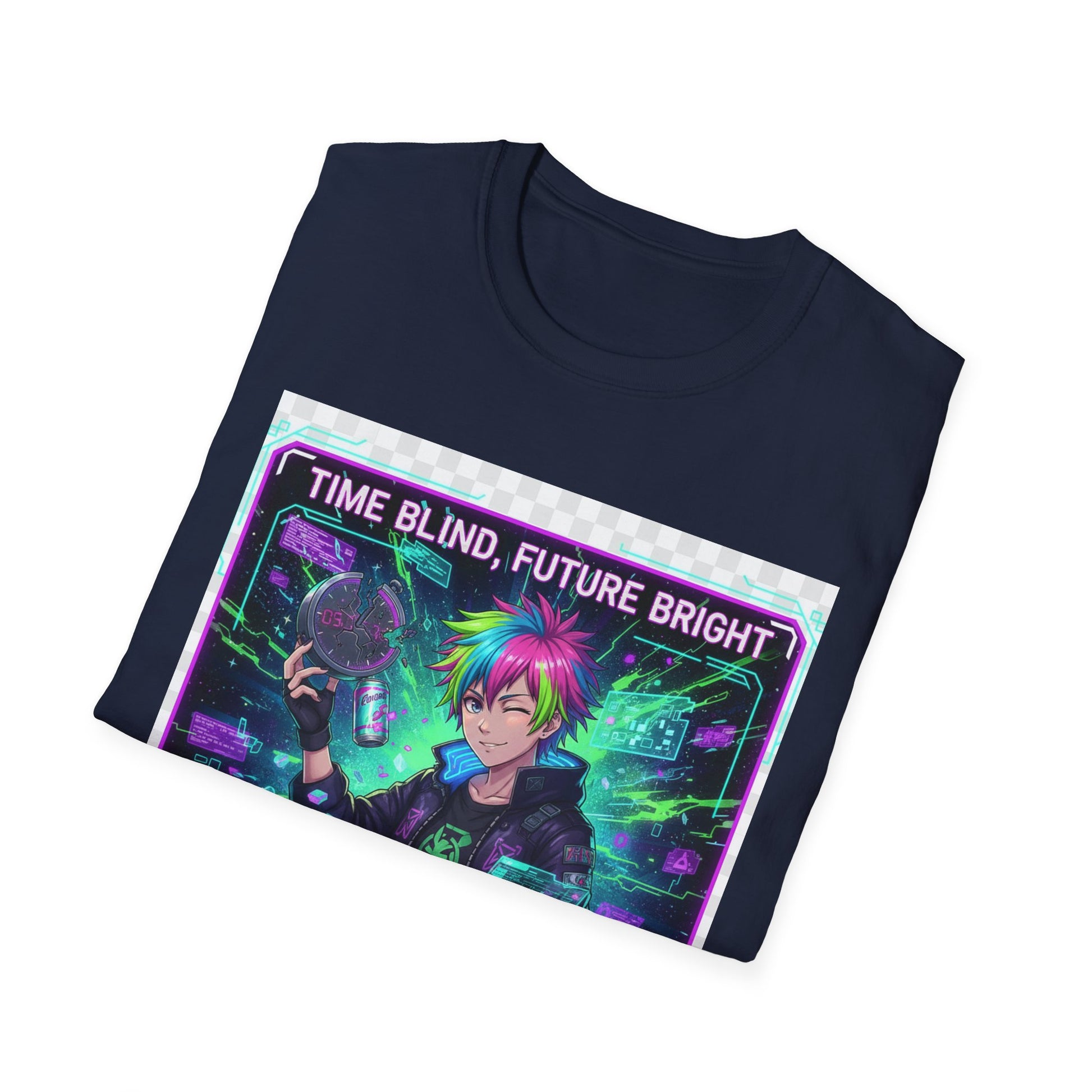 Cyberpunk Anime T-Shirt – ‘Time Blind Future Bright’ | Neurospicy Gamer Humor Tee, ADHD Pride Otaku Streetwear