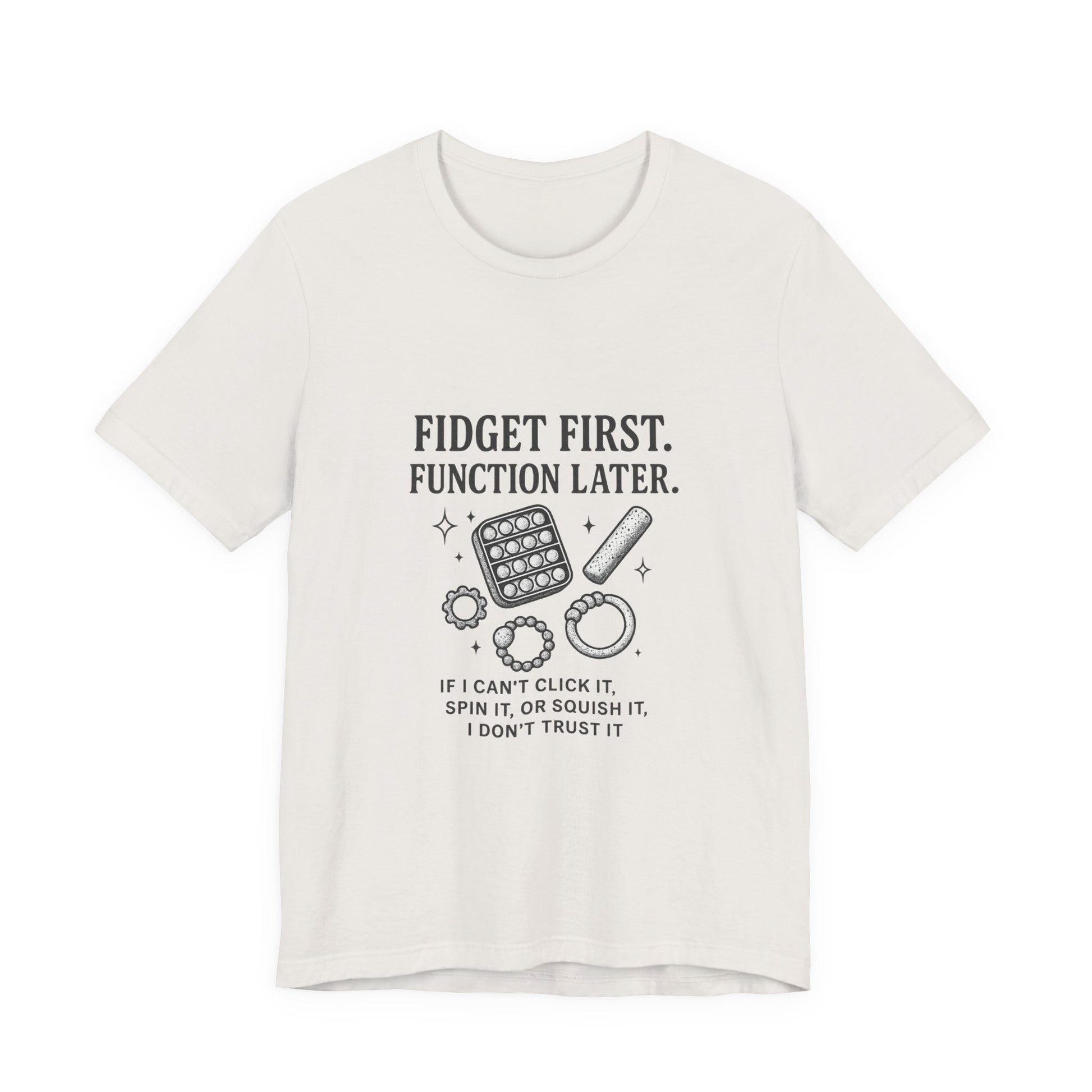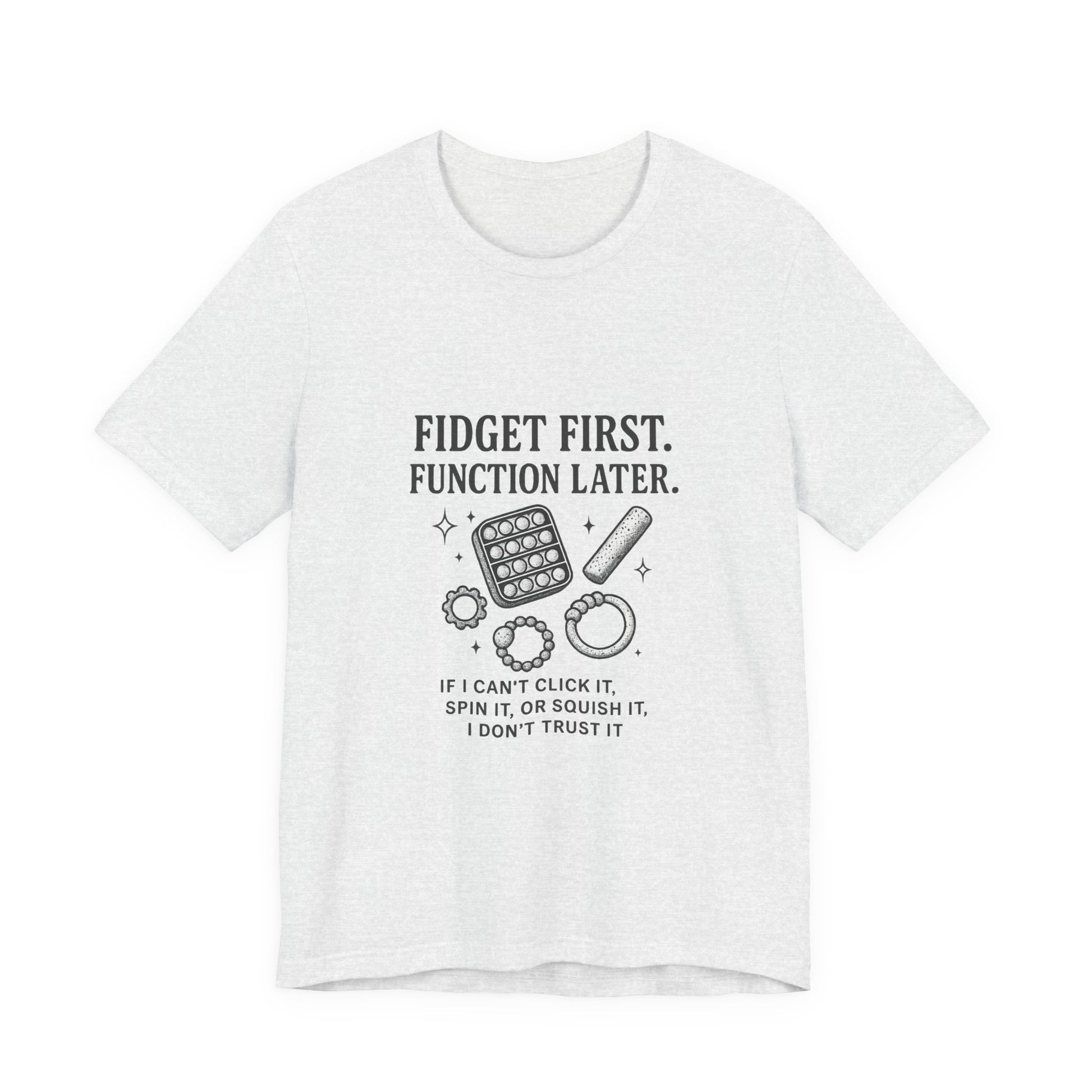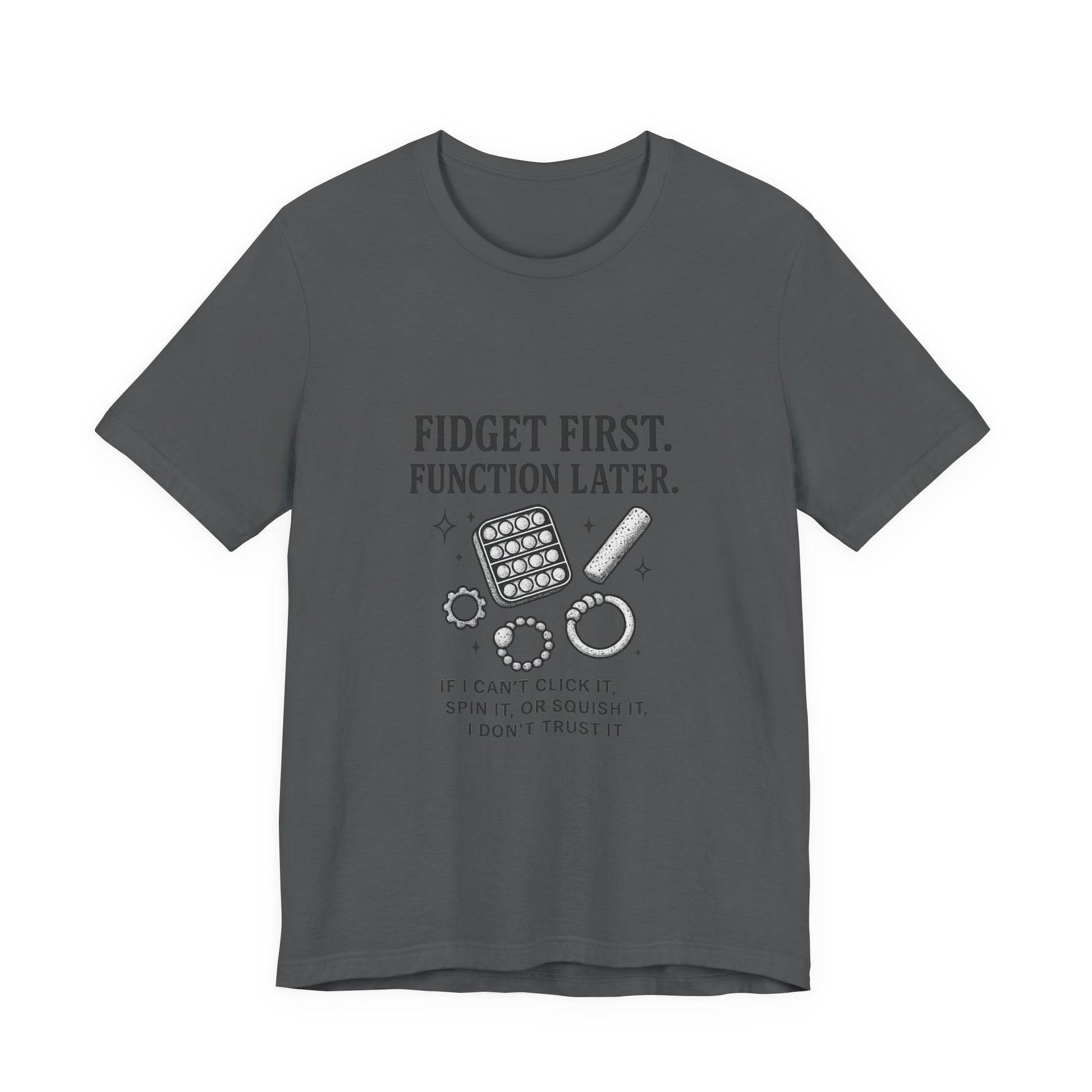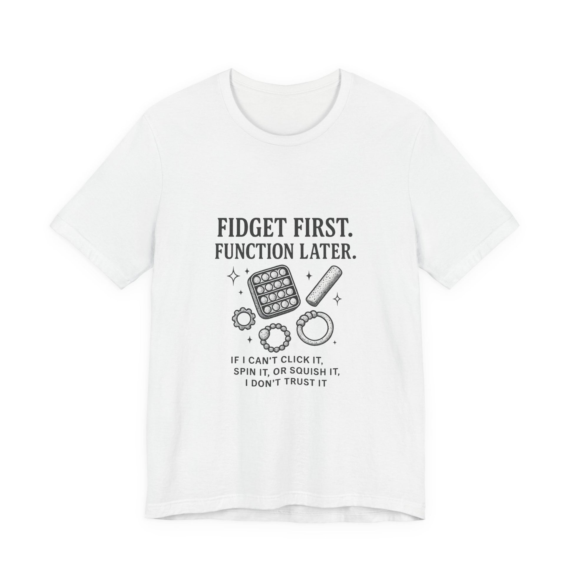 Fidget First T-Shirt - Fun Unisex Jersey Tee for Stress Relief, Gift for Gamers, Anxiety Relief Shirt, Unique Fidget Tee, Quirky Casual Wear