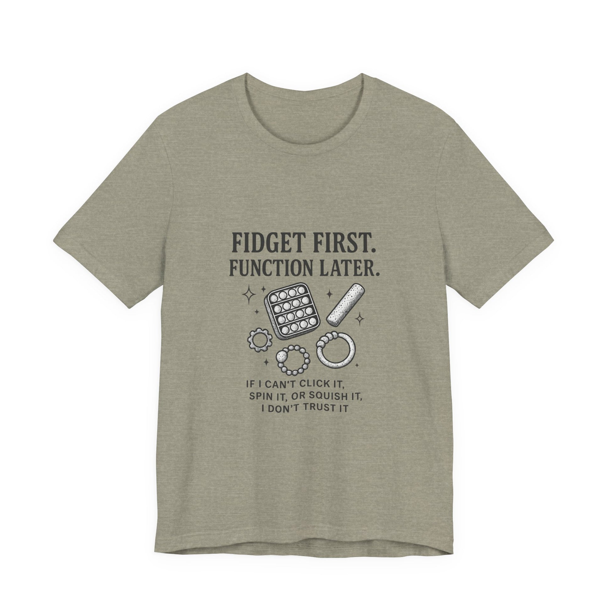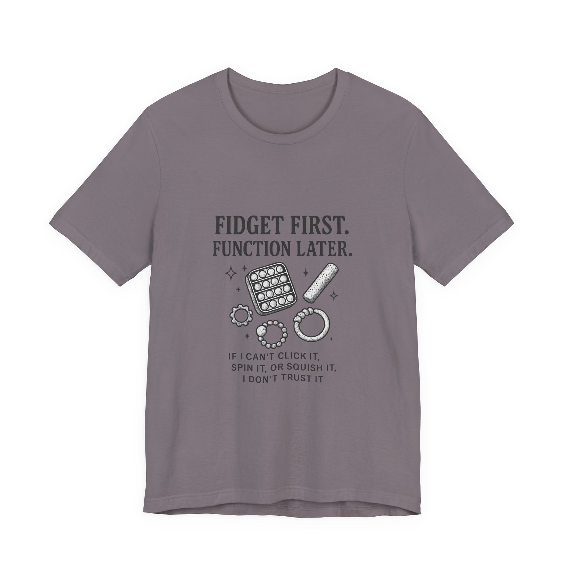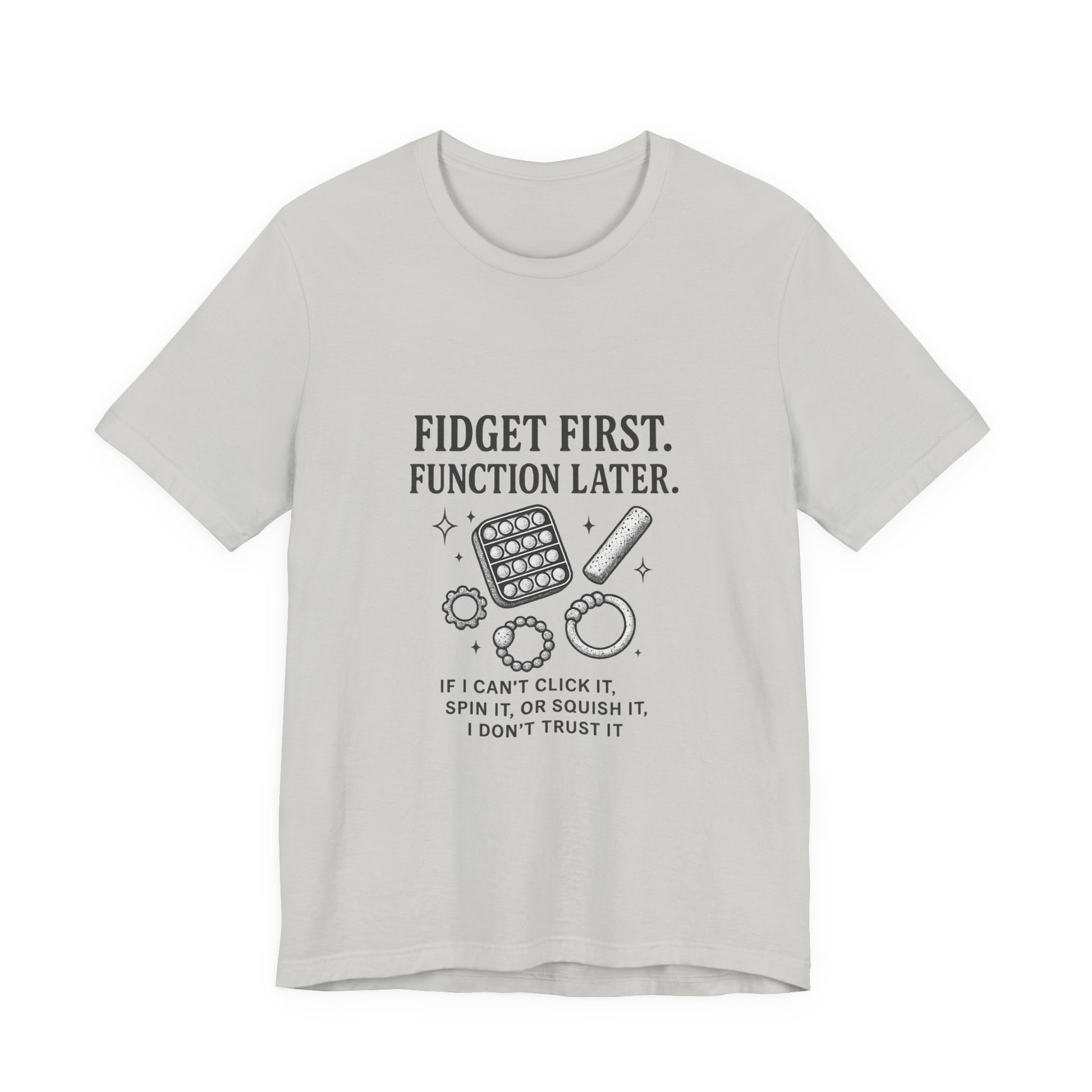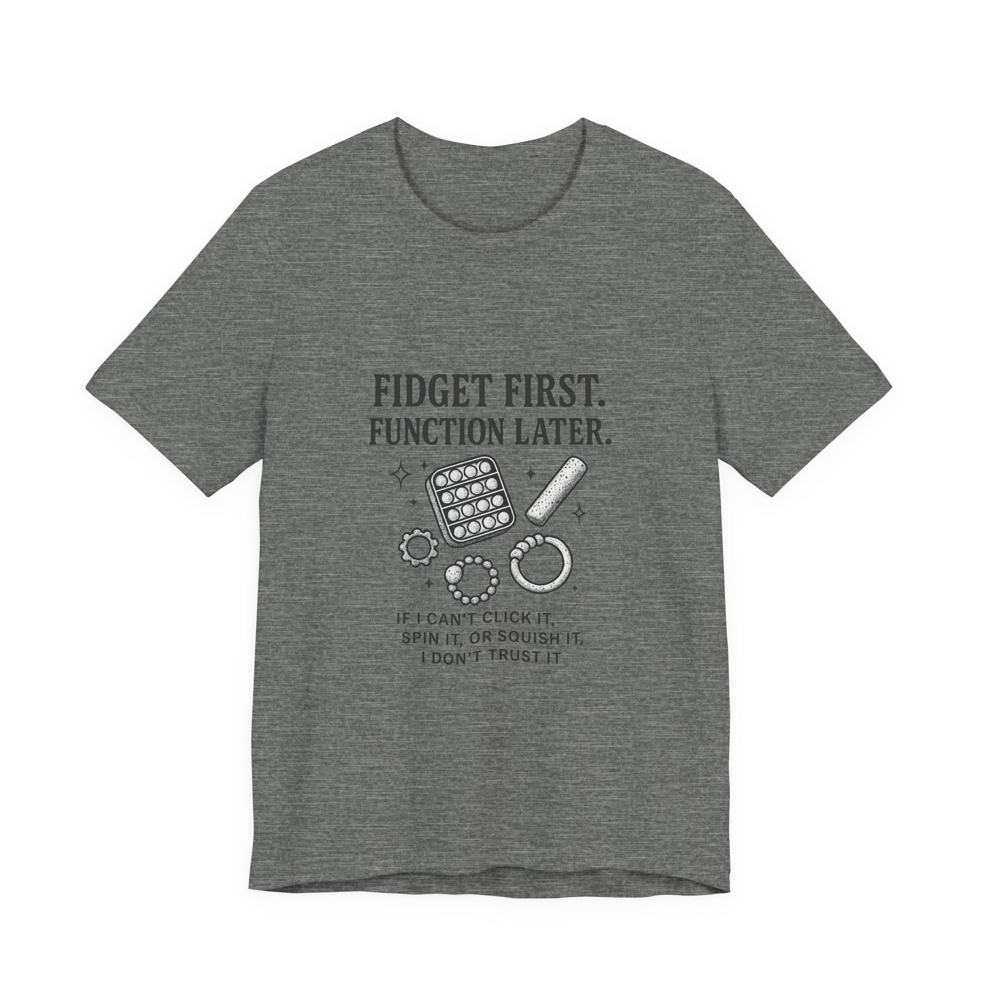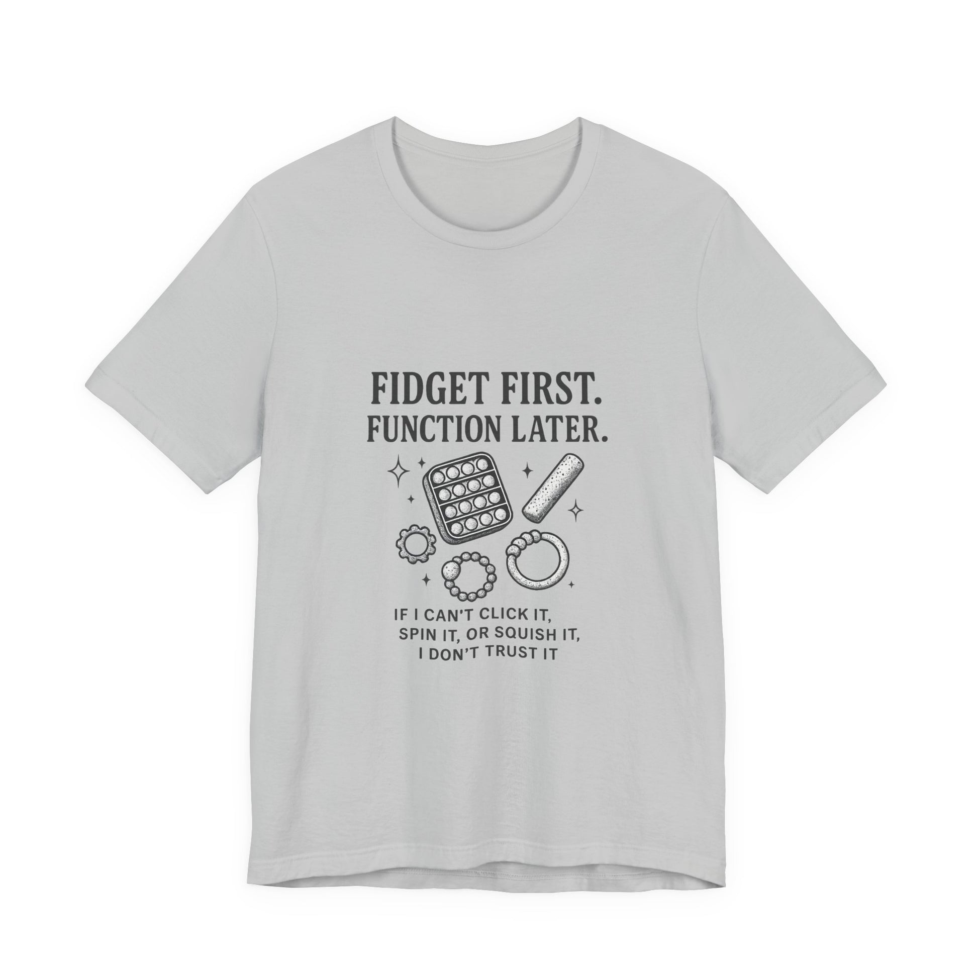 Fidget First T-Shirt - Fun Unisex Jersey Tee for Stress Relief, Gift for Gamers, Anxiety Relief Shirt, Unique Fidget Tee, Quirky Casual Wear