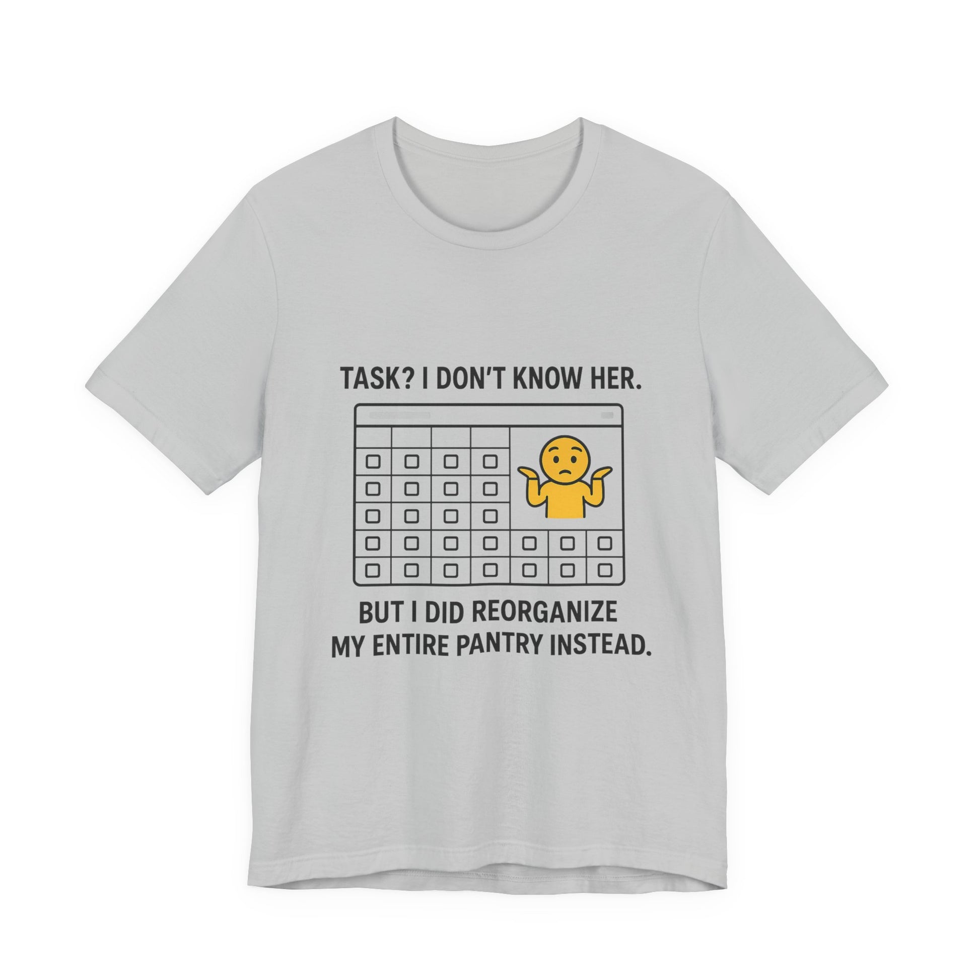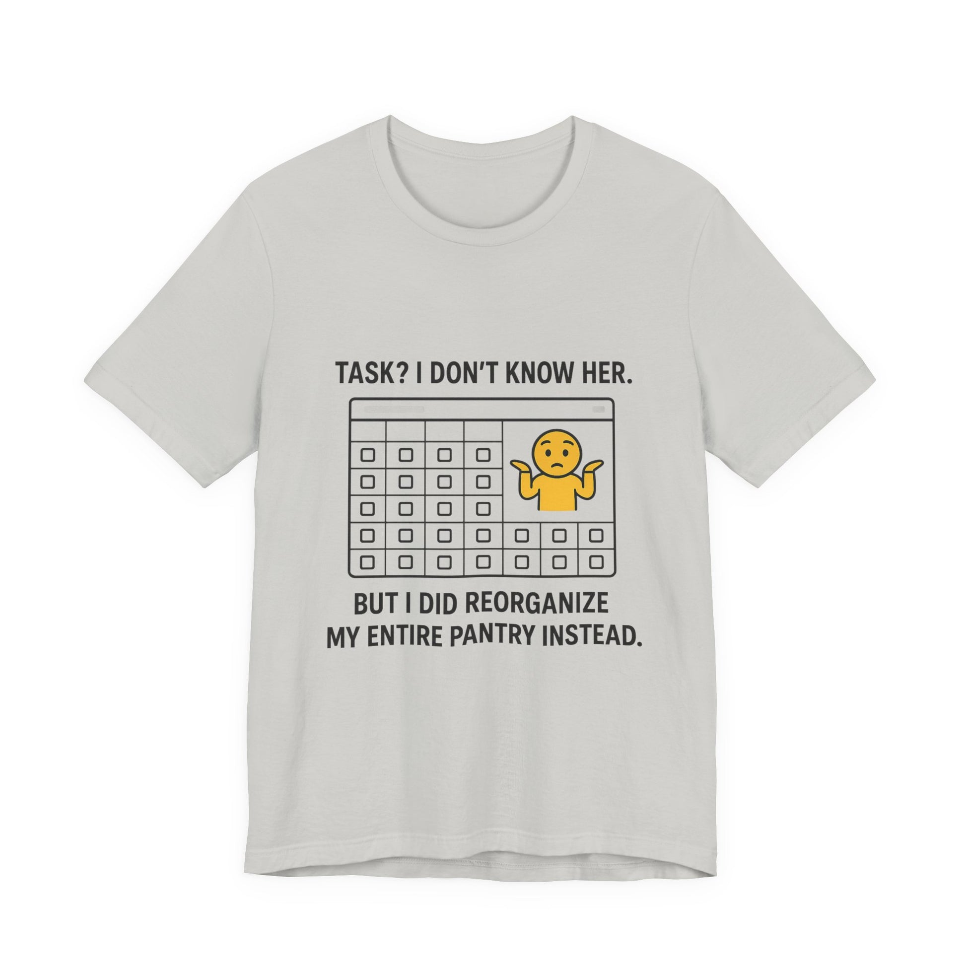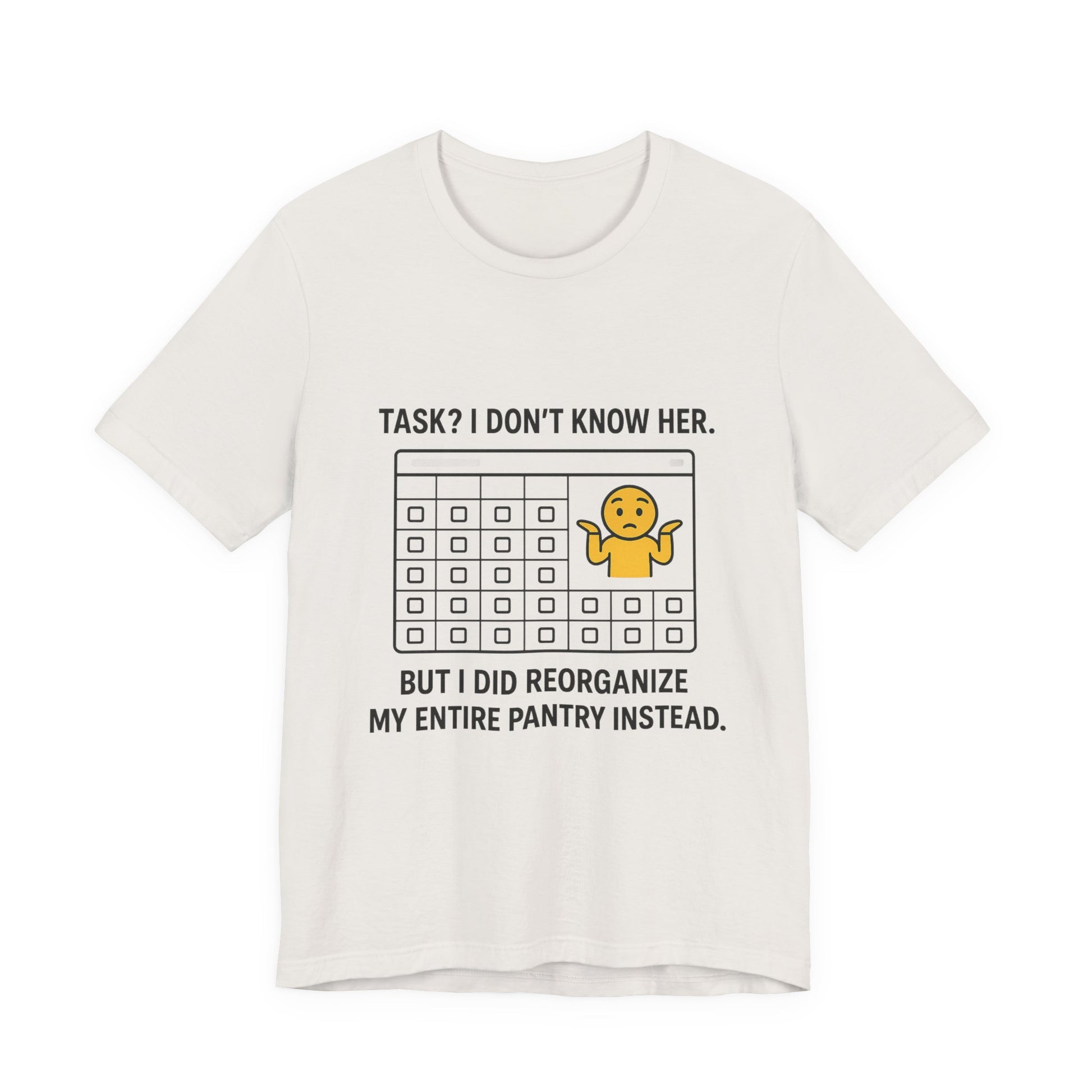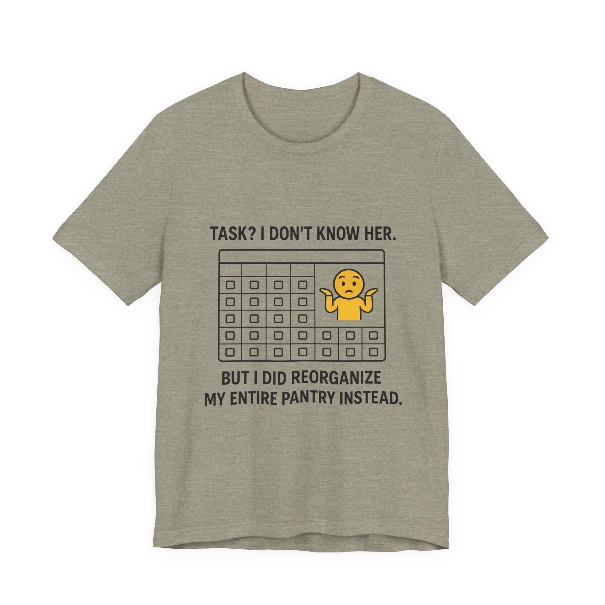 Humorous Pantry Organization Tee, Funny T-Shirt, Gift for Organizers, Quirky Casual Wear, Relatable Humor Shirt, Task Procrastination Tee