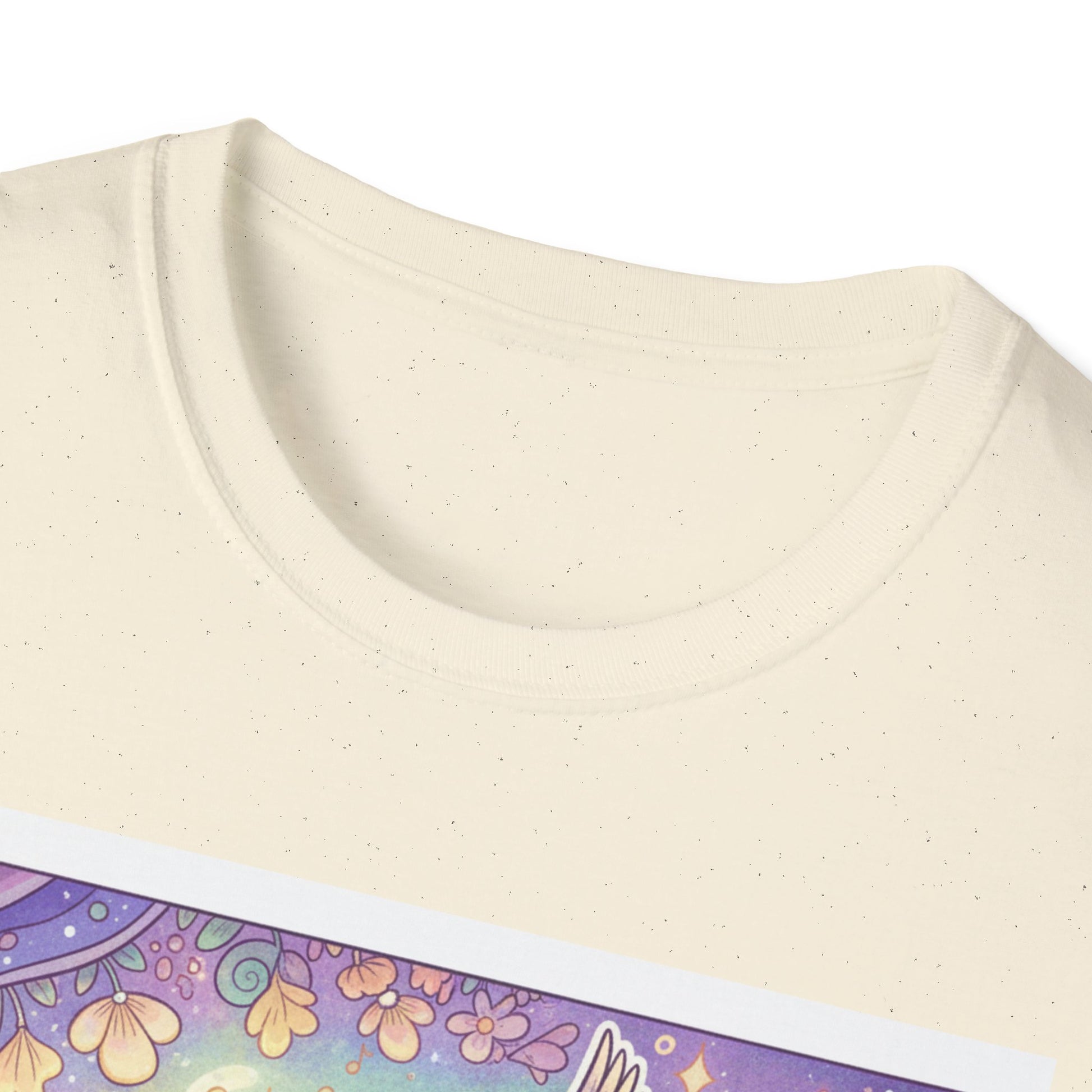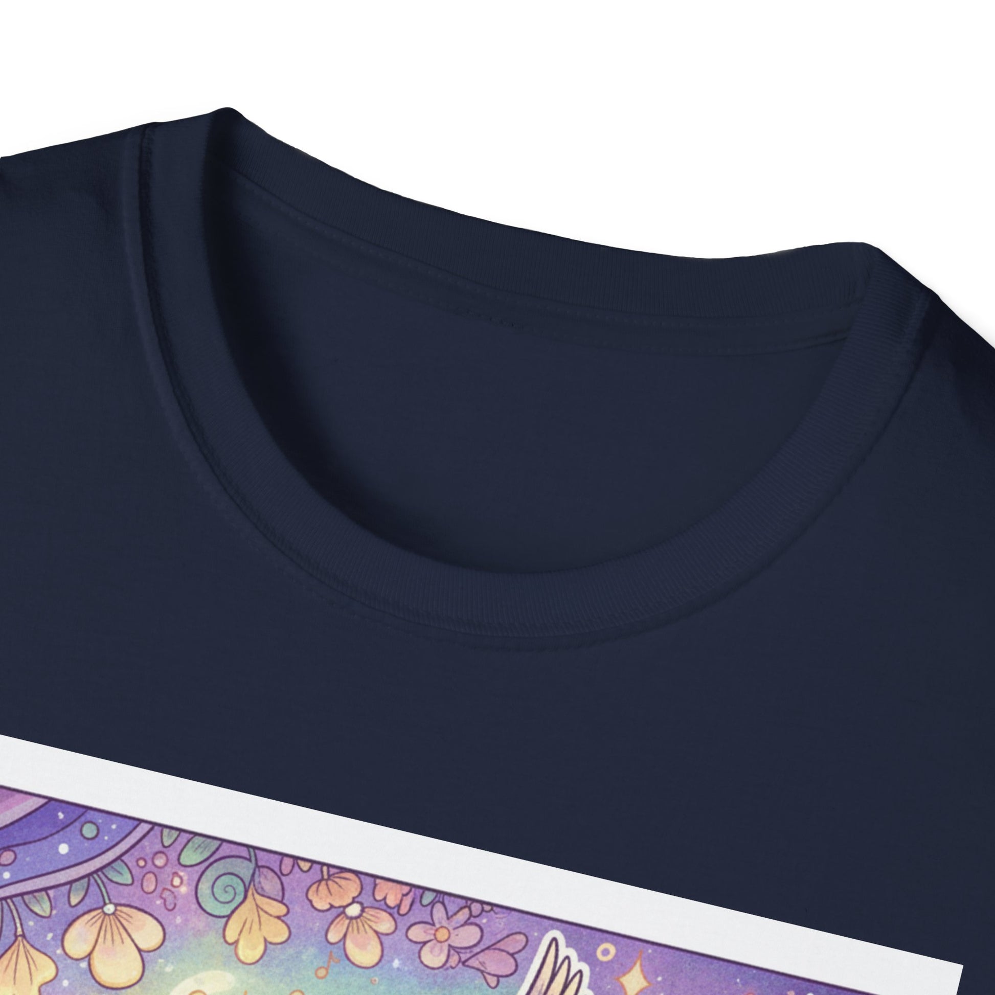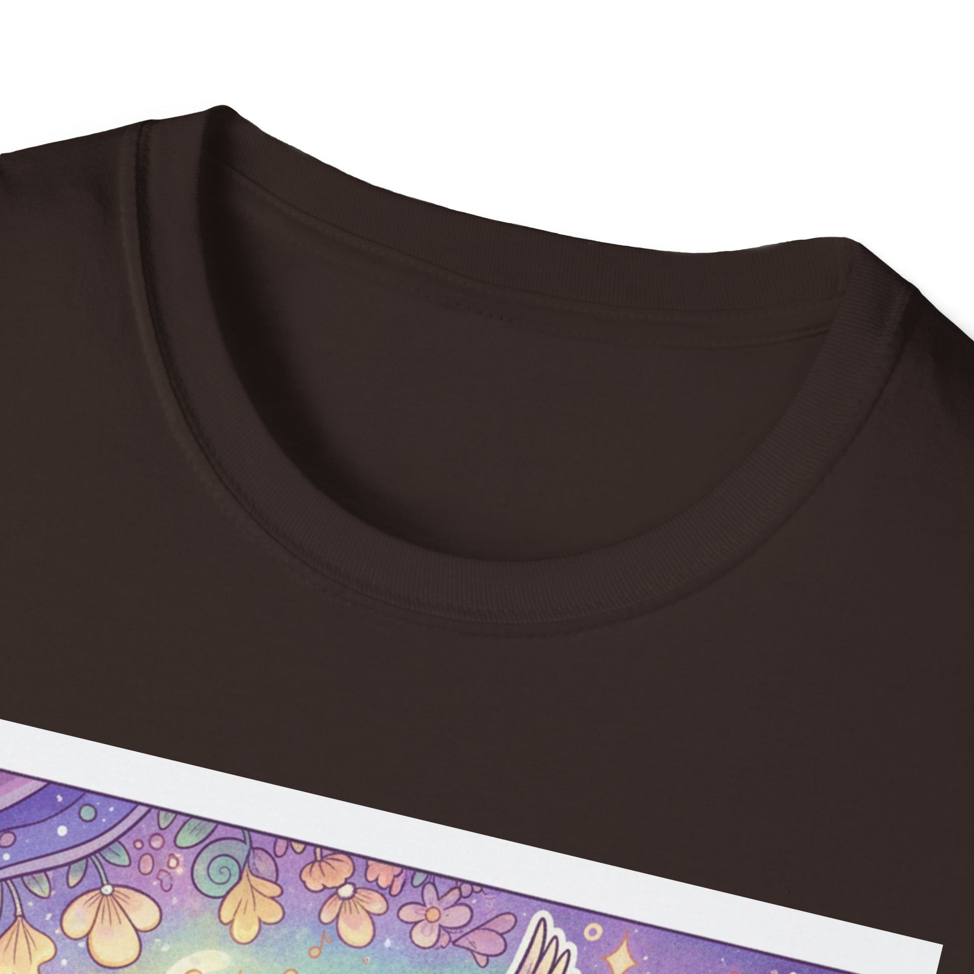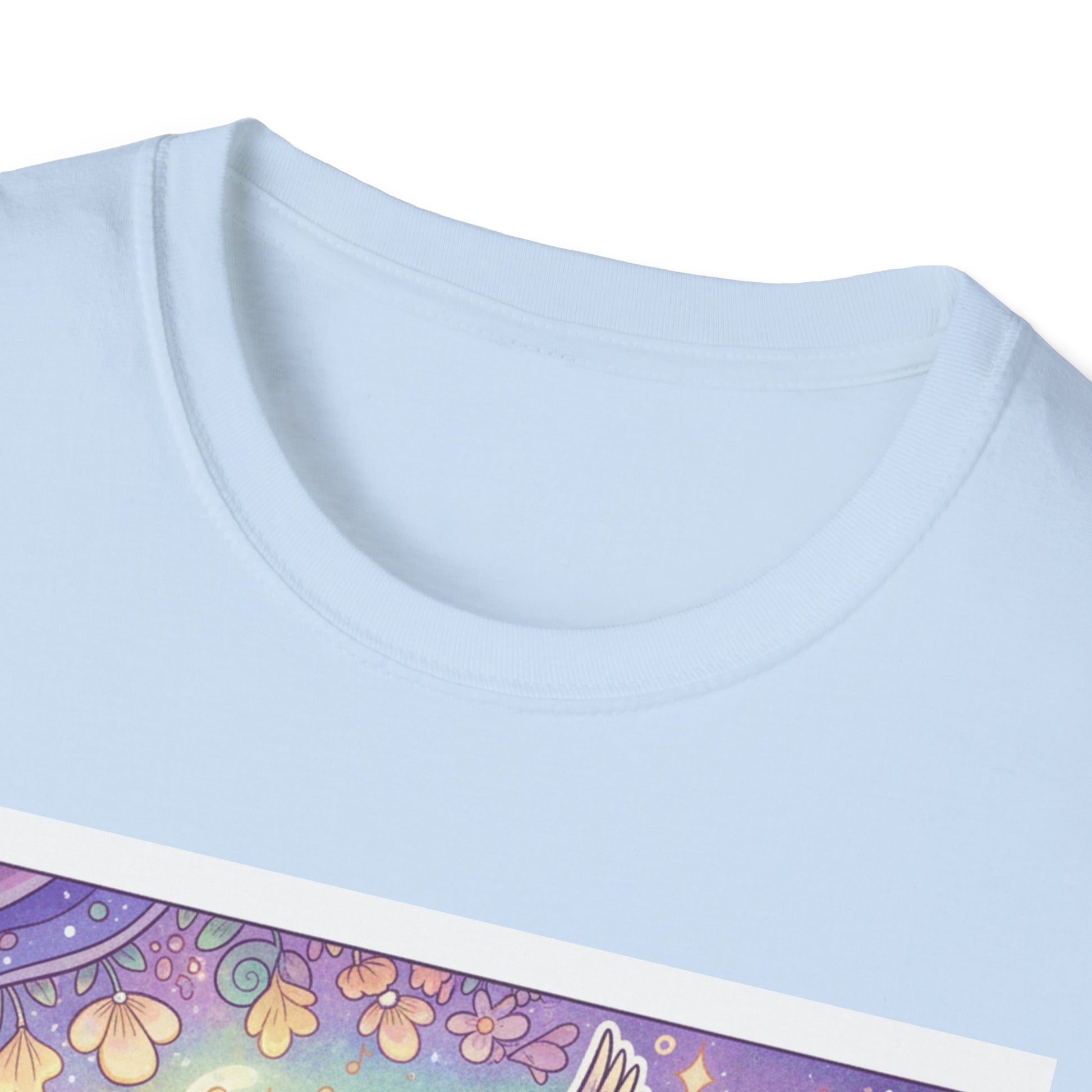 Embrace tranquility and self-acceptance with this unisex softstyle t-shirt, adorned with an enchanting design that features serene elements like a snail and a fluttering bird surrounded by a vivid landscape. This shirt radiates positivity and calm, making it a perfect addition to your laid-back wardrobe. Ideal for leisurely days at home, casual outings with friends, or even mindful meditation sessions, it instills a sense of peace wherever you go. This t-shirt is perfect for those who appreciate art, nature, and the importance of taking things slow. It's a thoughtful gift for birthdays, mindful holidays, or 'just because' moments, encouraging the wearer to live life at their own pace.