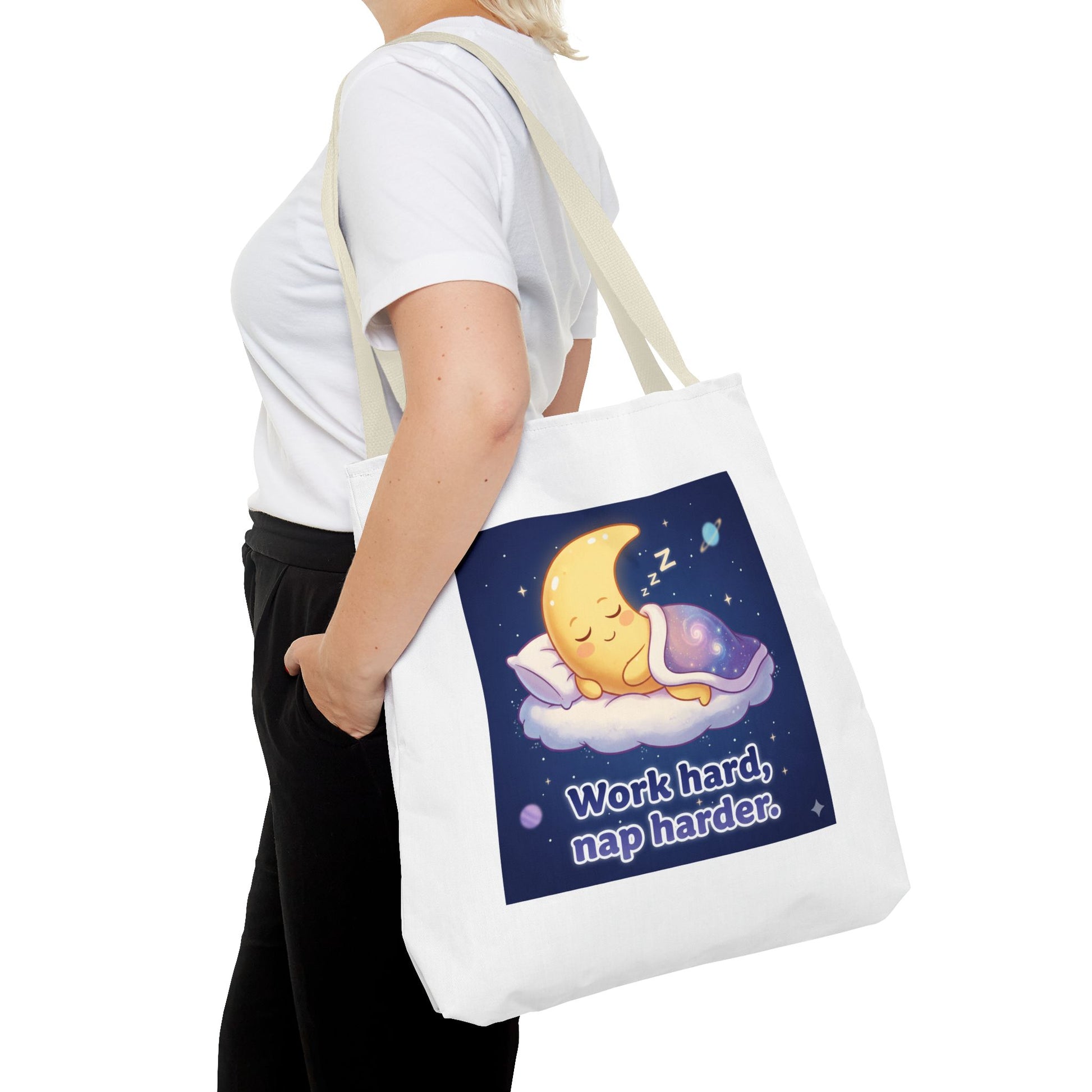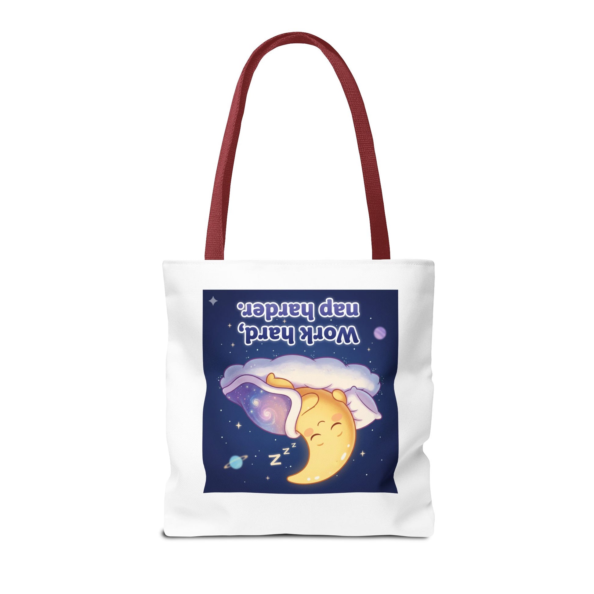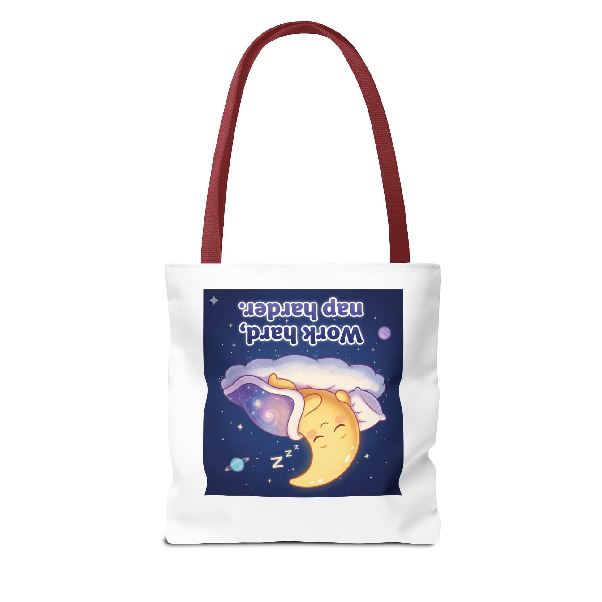 This whimsical Tote Bag brings a touch of joy and positivity to your everyday life. Featuring a charming design of a sleeping moon with the fun phrase "Work hard, nap harder," it radiates a playful, relaxed vibe that’s perfect for anyone who values comfort and humor. This bag is ideal for students, professionals, or anyone looking to carry their essentials with a smile. Versatile enough for daily errands, gym sessions, or a day at the beach, this tote is a thoughtful gift for birthdays, holidays, or just because. Celebrate nap time in style!
